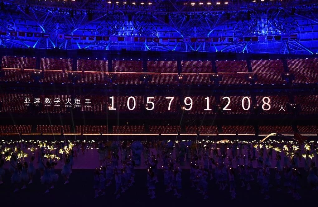 這是9月23日拍攝的開幕式現(xiàn)場顯示的亞運(yùn)數(shù)字火炬手人數(shù)。新華社記者黃宗治攝