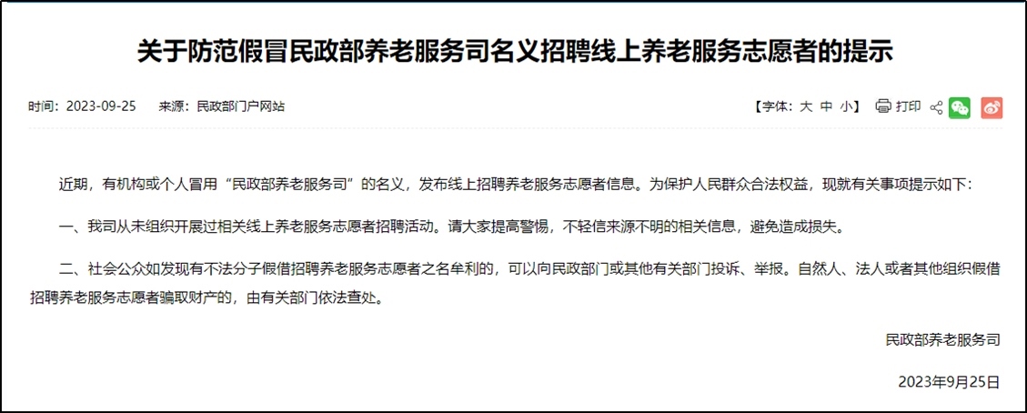·有機(jī)構(gòu)或個人冒用“民政部養(yǎng)老服務(wù)司”名義招聘志愿者,民政部發(fā)布提示。
