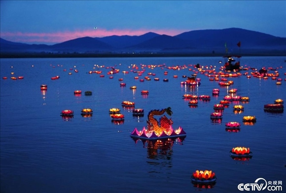 9月24日,吉林,蛟河市漂河鎮(zhèn)富江村舉行豐收節(jié)放河燈活動,村民和游人把一盞盞河燈放入松花湖中,表達(dá)對美好生活的向往與期盼。