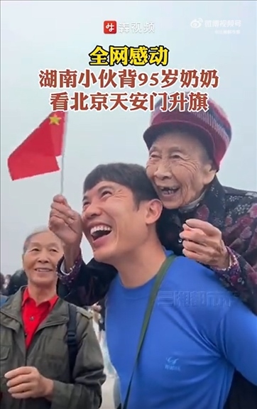 近日,湖南一名男子背著95歲的奶奶,從永州出發(fā)到北京天安門看升國旗??粗逍羌t旗冉冉升起,祖孫兩人露出了幸福的笑容。網(wǎng)友:這是“最美的風(fēng)景”。