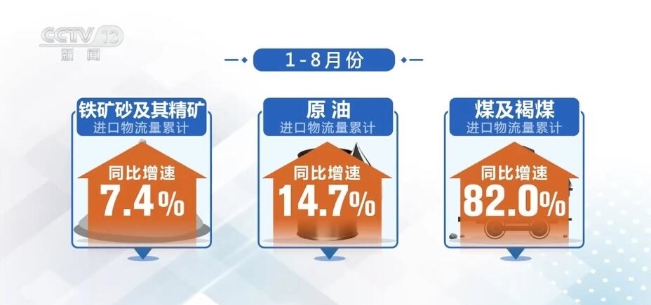從進(jìn)口來看,隨著內(nèi)需改善,進(jìn)口物流也呈現(xiàn)量價回升。1—8月份進(jìn)口物流總額同比增長14.4%,增速持續(xù)回升。從產(chǎn)品結(jié)構(gòu)看,原材料等大宗商品進(jìn)口增速有所加快,鐵礦砂及其精礦、原油、煤及褐煤進(jìn)口物流量累計同比增速分別為7.4%、14.7%、82.0%。