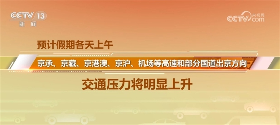 北京市交通部門表示,“雙節(jié)”假日期間,高速公路小客車免費通行、尾號不限行等措施帶動群眾出行需求集中釋放,預(yù)計中超、中網(wǎng)、演出等大型活動舉辦場地周邊道路短時車流集中,連接城區(qū)和郊區(qū)的各條高速公路將出現(xiàn)上午出京、下午進(jìn)京的車流高峰,預(yù)計假期各天上午,京承、京藏、京港澳、京滬、機場等高速和部分國道出京方向的交通壓力將明顯上升。