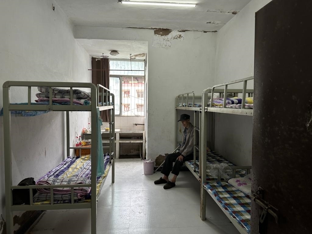 太白西村4組村民譚建和老爺爺行動不便,坐在鋪著干凈格子床單的宿舍床上望向窗外?!扒疤煜挛纾鐓^(qū)的車來接的我和老伴,安置點吃喝都好,宿舍住起來也挺舒服。兒子們擔心我,他們過不來,一天就打好幾通電話,我說都好著呢、好著呢。”譚爺爺說。