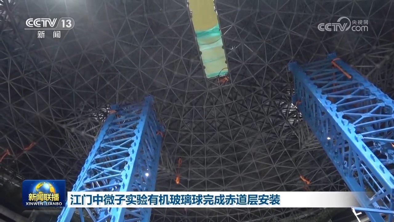 央視網(wǎng)消息(新聞聯(lián)播):大科學裝置江門中微子實驗正在緊張建設中,位于地下700米的中心探測器日前完成了世界最大單體有機玻璃球赤道層的安裝,探測器整體工程過半。