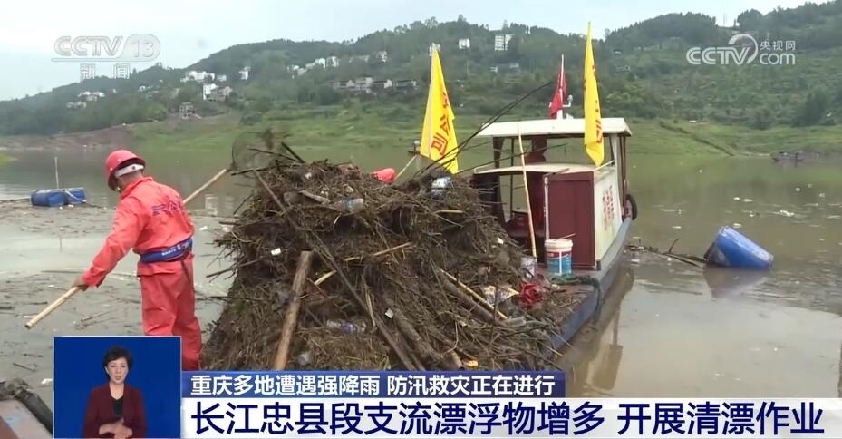 近段時間,重慶的強降雨天氣還導致長江重慶忠縣段各支流漂浮物增多。目前,多艘清漂船來回穿梭在江面上,分區(qū)域開展清漂作業(yè),清漂工人將江面漂浮物一一打撈上船,轉(zhuǎn)運上岸后再進行集中處理。7月3日以來,忠縣累計出動人工打撈船次80余船次,累計打撈垃圾約400余噸。此外,此輪長江洪峰過境忠縣后,長江忠縣段水位迎來上漲,當?shù)叵嚓P部門正密切關注水位變化。
