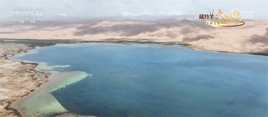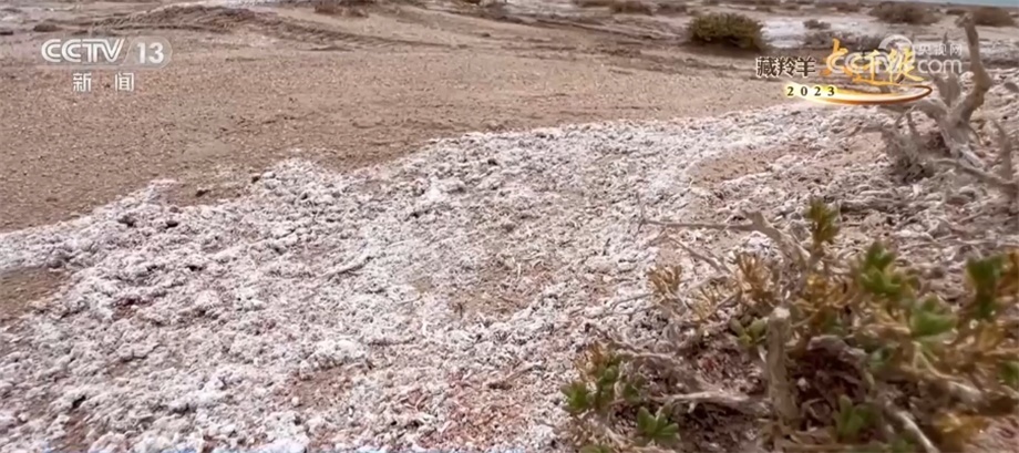 總臺記者 崔寧:你看這個鹽堿地長的是典型的沙漠性植物,然后一路鹽堿,到前面就是浩瀚的阿雅克庫木湖。這是阿爾金山最大的湖泊,這兒的海拔有4300米左右,所以我們在這個鏡頭當(dāng)中就看到特別奇特的景象,植物、鹽堿、鹽花、水、大片大片的湖泊,非常神奇。