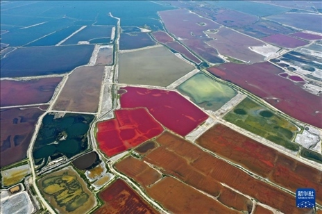 夏日時節(jié),隨著氣溫不斷升高,山西運(yùn)城鹽湖呈現(xiàn)出色彩斑斕的景象。從空中俯瞰,猶如天然“調(diào)色盤”。