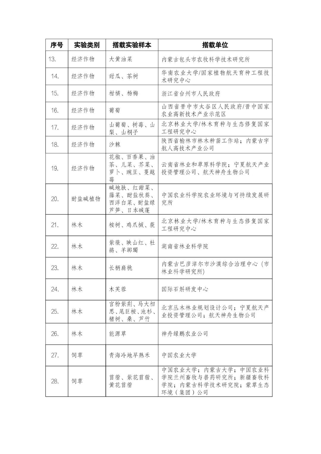 載人航天工程立項實施以來,始終注重提升工程綜合效益,致力服務(wù)國家經(jīng)濟(jì)社會發(fā)展。在工程歷次飛行任務(wù)中,均安排了航天育種搭載實驗項目。從神舟十六號載人飛船開始,中國載人航天工程辦公室向社會公開征集航天育種搭載實驗項目,于3月23日在工程官網(wǎng)發(fā)布《關(guān)于征集神舟系列載人飛船航天育種實驗項目的機會公告》,同時在工程官網(wǎng)開辟“航天育種搭載實驗”管理平臺,接受搭載需求單位申報實驗項目。辦公室組織專家對申報項目進(jìn)行評審,遴選出53個單位的136種份航天育種實驗材料實施搭載。包括農(nóng)作物47份(糧食作物種子12份、經(jīng)濟(jì)作物種子28份、耐鹽堿植物7份);林草、花卉和藥用植物76份(林木17份、飼草21份、花卉7份、藥用植物31份);微生物和其它13種(農(nóng)業(yè)微生物菌種2種、工業(yè)微生物菌種3種、食用菌3種、藻類和苔蘚5種)(清單附后)。