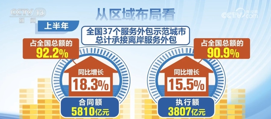 從區(qū)域布局看,上半年,全國37個服務外包示范城市總計承接離岸服務外包合同額5810億元,執(zhí)行額3807億元,同比分別增長18.3%和15.5%,分別占全國總額的92.2%和90.9%。