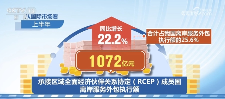從國際市場看,上半年,承接區(qū)域全面經濟伙伴關系協(xié)定(RCEP)成員國離岸服務外包執(zhí)行額1072億元,同比增長22.2%,合計占我國離岸服務外包執(zhí)行額的25.6%。