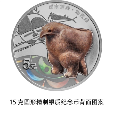 15克圓形銀質(zhì)紀念幣背面圖案為陶鷹鼎造型,襯以仰韶文化相關紋飾,并刊“國家寶藏·陶鷹鼎”字樣及面額。