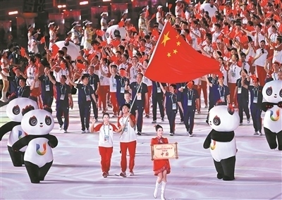 中國大學生體育代表團運動員及官員,在兩位旗手郭涵煜和胡朕卓的引領下迎面走來,全場掌聲雷動。