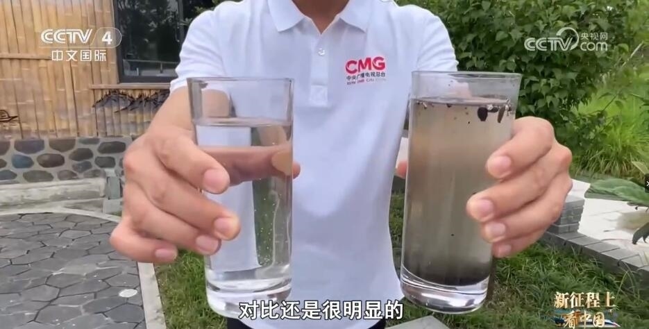 農(nóng)污管理技術(shù)員 韋星任:這邊有三個杯子。首先,這杯水是處理之前的,你可以對感受一下,這個是生活污水。第二個杯子里就是我們終端出水。