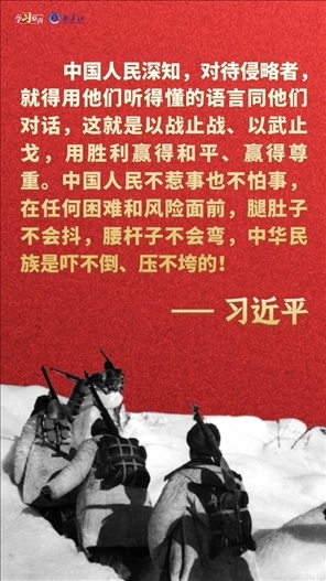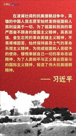 偉大抗美援朝精神跨越時(shí)空、歷久彌新。我們要銘記抗美援朝戰(zhàn)爭的艱辛歷程和偉大勝利,敢于斗爭、善于斗爭,知難而進(jìn)、堅(jiān)韌向前,把新時(shí)代中國特色社會主義偉大事業(yè)不斷推向前進(jìn)。