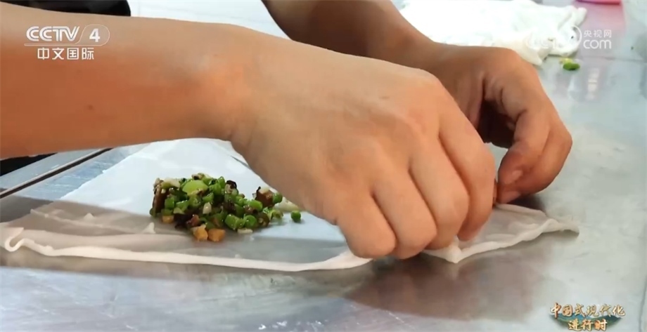 除了“射手王”,網(wǎng)友們還給他起了一個(gè)外號(hào)叫“卷粉王”。今年34歲的董永恒在縣城開了一家小店,售賣當(dāng)?shù)貍鹘y(tǒng)特色美食卷粉。在球場(chǎng)上他腳底利索,沒(méi)想到手上更利落,董永恒一天要包1000多個(gè)卷粉。