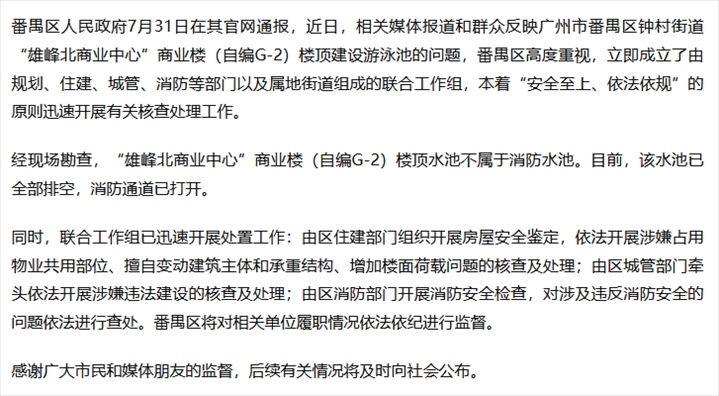 ·廣州番禺通報(bào)“樓頂建豪華泳池”:開展涉嫌違法建設(shè)核查。