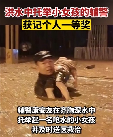 近日,四川瀘州古藺遭遇暴雨洪災(zāi)多人被困。輔警康安友在齊胸深水中托舉起一名嗆水的小女孩,并及時(shí)送醫(yī)救治。7月29日,康安友獲記個(gè)人一等獎。