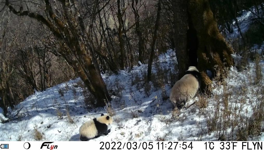 這是2022年3月5日大熊貓國家公園寶興片區(qū)紅外相機(jī)拍攝的大熊貓母子畫面。(四川省雅安市寶興縣委宣傳部供圖)