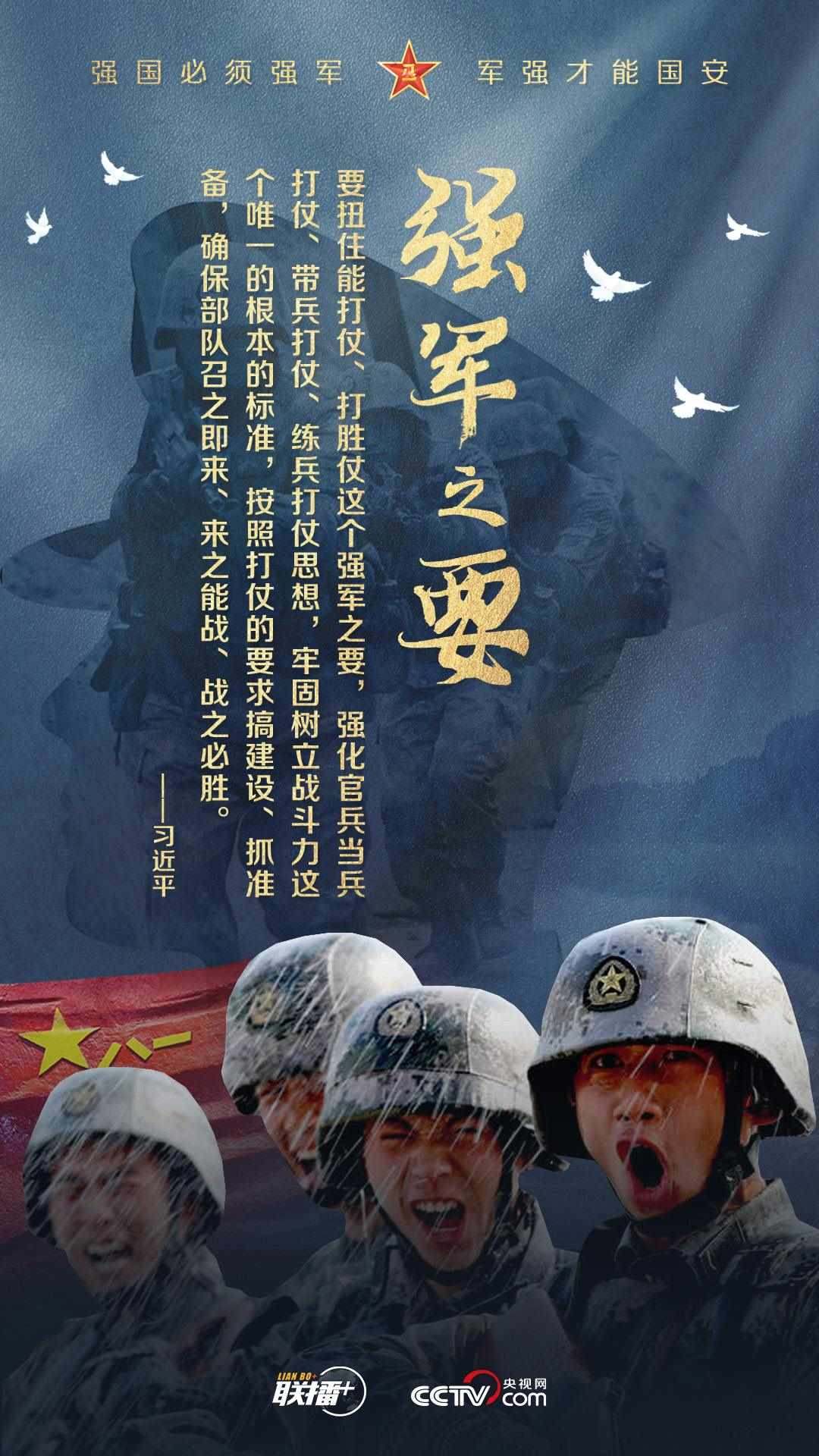 黨的十八大以來,習(xí)近平主席始終高度重視國防和軍隊(duì)建設(shè),為全軍擘畫強(qiáng)軍興軍藍(lán)圖、指引奮進(jìn)方向。值此中國人民解放軍建軍96周年之際,央視網(wǎng)《聯(lián)播+》欄目制作強(qiáng)軍海報(bào),與您一起學(xué)習(xí)習(xí)主席的強(qiáng)軍思想。