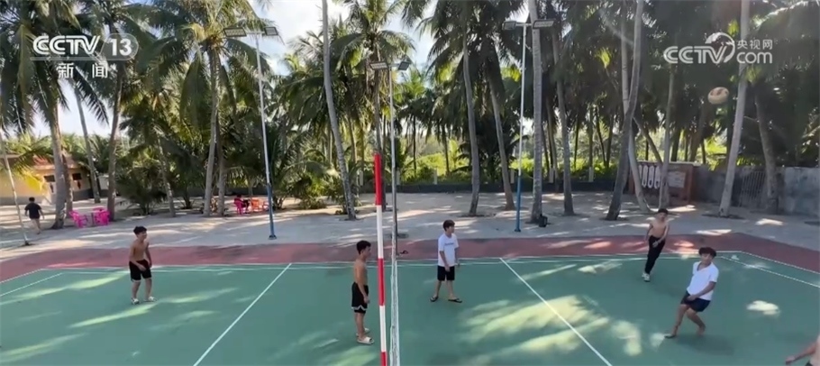 這塊掩映在椰林中的球場,是文昌市東郊鎮(zhèn)椰海村排球場,這是一塊標(biāo)準(zhǔn)大小的場地,球網(wǎng)、邊線一應(yīng)俱全。傍晚時分,天氣還比較炎熱,球場上已經(jīng)有不少孩子在打球。