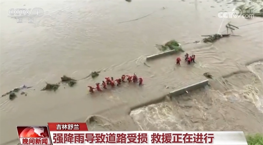 吉林省此輪最大降水量出現(xiàn)在舒蘭市永勝林場,達(dá)到489毫米。強(qiáng)降雨導(dǎo)致舒蘭多地出現(xiàn)險情,通往村屯的道路被損毀,救援人員進(jìn)入村屯展開救援。
