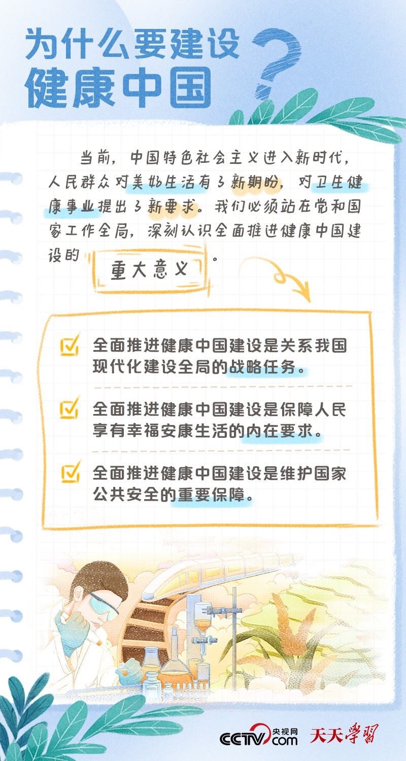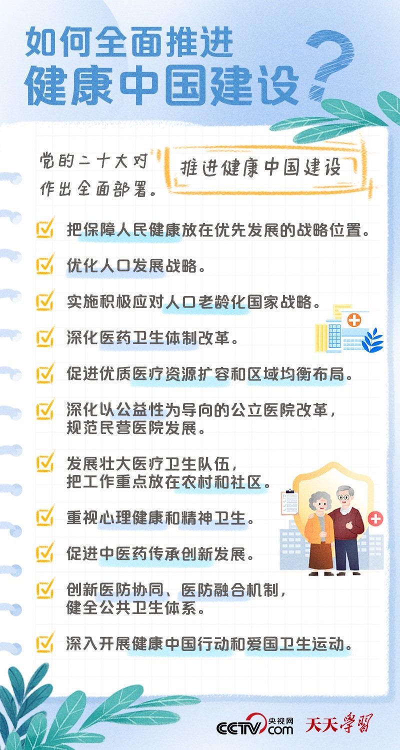 黨的二十大報告將“建成健康中國”作為到2035年我國發(fā)展的總體目標之一,并指出,人民健康是民族昌盛和國家強盛的重要標志,把保障人民健康放在優(yōu)先發(fā)展的戰(zhàn)略位置,完善人民健康促進政策。什么是健康中國?如何全面推進健康中國建設(shè)?央視網(wǎng)《天天學(xué)習(xí)·學(xué)習(xí)筆記》特梳理相關(guān)內(nèi)容,為您解讀總書記治國理政關(guān)鍵詞——健康中國。