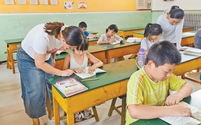 8月8日,河北省獻縣樂壽鎮(zhèn)東翟小學安置點內(nèi),學校老師為學生輔導功課。本報記者 邵玉姿攝