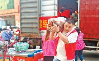 8月6日,河北省涿州市碼頭鎮(zhèn)向五村,天津市阿米瑪瑪何莊子農(nóng)產(chǎn)品批發(fā)市場工作人員為受災群眾免費提供盒飯。本報記者 雷 聲攝