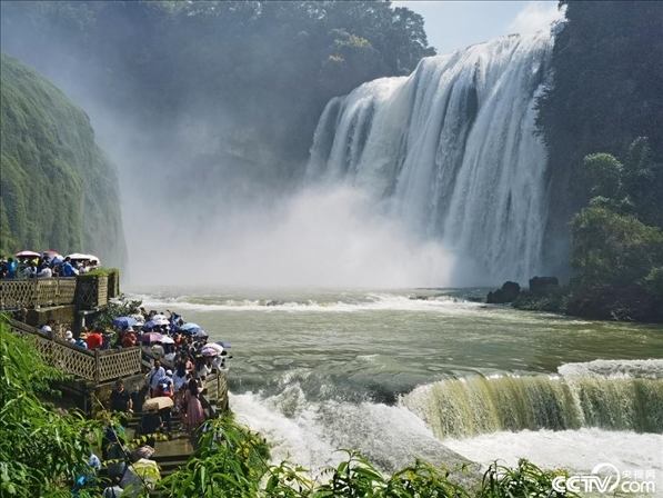 8月11日,貴州安順,游客在黃果樹(shù)瀑布景區(qū)游覽。暑期以來(lái),黃果樹(shù)風(fēng)景區(qū)瀑布水勢(shì)磅礴、飛瀉而下,進(jìn)入最佳觀賞季。