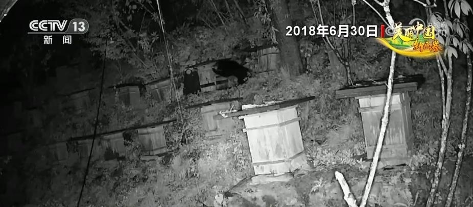 在湖北堵河源國家級自然保護區(qū),經常會發(fā)生黑熊下山偷食百姓的莊稼、蜂蜜等農產品。記者通過當?shù)匾晃淮迕裉峁┑囊曨l看到,2018年晚上一頭成年黑熊來到一蜂箱放置點,黑熊為了取食蜂蜜推倒了一箱蜂箱,并啃食了幾口蜂蜜。
