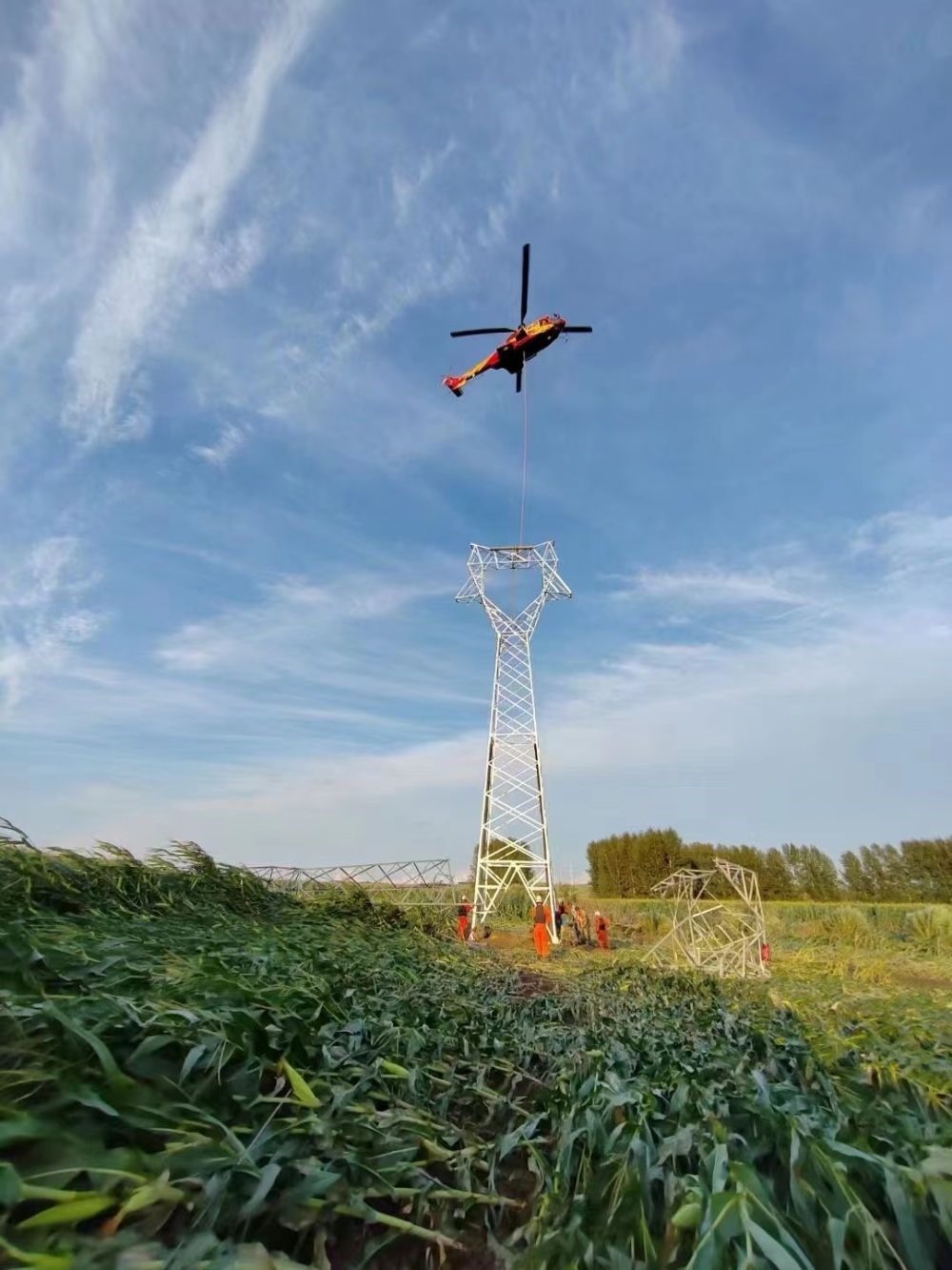 9日,在海林市110千伏長(zhǎng)海輸電線(xiàn)路搶修現(xiàn)場(chǎng),一架直升機(jī)吊裝起沉重的輸電鐵塔,運(yùn)送到指定地點(diǎn)。這個(gè)輸電鐵塔處于河流中心島位置,無(wú)法使用常規(guī)起重設(shè)備。國(guó)家電網(wǎng)公司迅速?gòu)膰?guó)網(wǎng)遼寧電力、國(guó)網(wǎng)空間技術(shù)公司等單位調(diào)配直升機(jī)支援黑龍江,解決輸電鐵塔吊裝、運(yùn)輸?shù)葐?wèn)題。