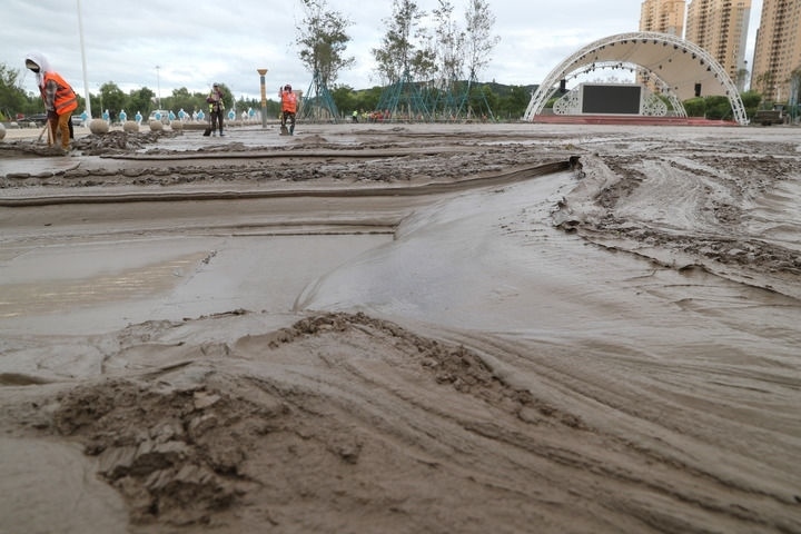 鏟車(chē)鏟起路上的大塊淤泥倒入翻斗車(chē),工人們有的手拿鐵鍬清理人行道,有的用水槍沖刷路面……9日下午,在尚志市東浦新區(qū)一座公園附近的道路上,洪水退去后的清淤工作正在進(jìn)行。