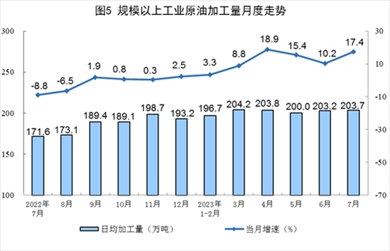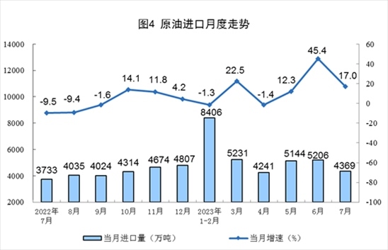 原油產(chǎn)量小幅增加,進口保持較快增長。7月份,生產(chǎn)原油1731萬噸,同比增長1.0%,增速比6月份放緩0.9個百分點,日均產(chǎn)量55.8萬噸。進口原油4369萬噸,同比增長17.0%,增速比6月份回落28.4個百分點。