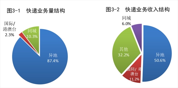 1-7月,郵政行業(yè)業(yè)務(wù)收入(不包括郵政儲蓄銀行直接營業(yè)收入)累計(jì)完成8482.3億元,同比增長10.5%。其中,快遞業(yè)務(wù)收入累計(jì)完成6495.3億元,同比增長10.5%。7月份,郵政行業(yè)寄遞業(yè)務(wù)量完成131.6億件,同比增長9.7%。其中,快遞業(yè)務(wù)量完成107.7億件,同比增長11.7%。7月份,郵政行業(yè)業(yè)務(wù)收入完成1194.5億元,同比增長5.3%。其中,快遞業(yè)務(wù)收入完成952.4億元,同比增長6.0%。1-7月,同城、異地、國際/港澳臺快遞業(yè)務(wù)量分別占全部快遞業(yè)務(wù)量的10.3%、87.4%和2.3%;業(yè)務(wù)收入分別占全部快遞收入的6.0%、50.6%和11.2%。與去年同期相比,同城快遞業(yè)務(wù)量的比重下降1.7個(gè)百分點(diǎn),異地快遞業(yè)務(wù)量的比重上升1.1個(gè)百分點(diǎn),國際/港澳臺業(yè)務(wù)量的比重上升0.6個(gè)百分點(diǎn)。