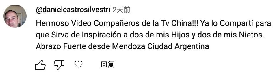 網(wǎng)友danielcastrosilvestri:“中國電視臺的朋友們,這個(gè)視頻太好看了!??!我把它分享出去,希望它能夠給我的兩個(gè)孩子和兩個(gè)孫子帶來啟發(fā)。我來自阿根廷的門多薩市,致禮。”