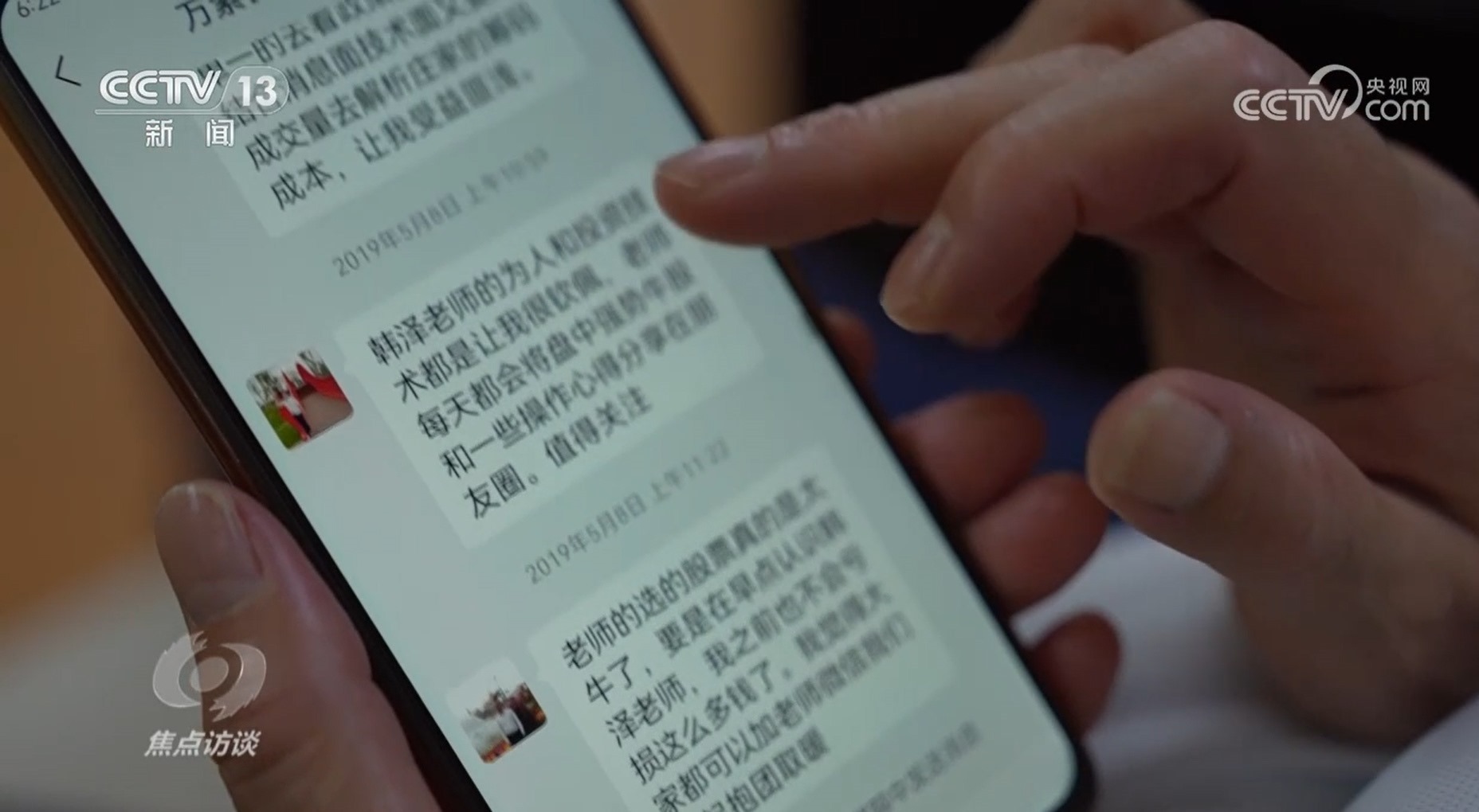 在這個群里,李女士認(rèn)識了一個叫“韓澤”的老師,平時在群里分享股市消息,晚上還會開直播課,說什么股能賺錢,指導(dǎo)大家,有的確實也賺了錢。