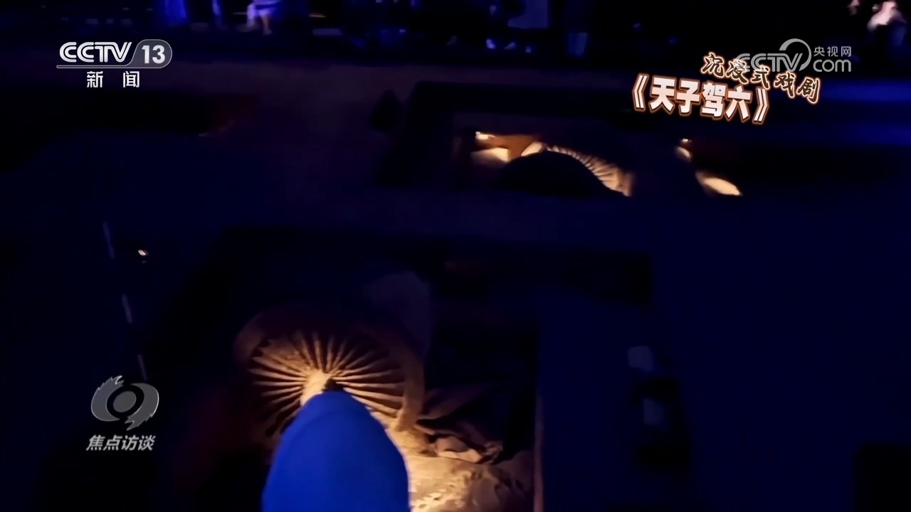 慕順興就是本地人,劇場(chǎng)開業(yè)后,他第一次來就被吸引住了,于是辦了年卡,不光自己看戲,還經(jīng)常給游客推薦劇目,《天子駕六》就是他經(jīng)常推薦的劇。劇場(chǎng)里沒有舞臺(tái),也沒有座位,觀眾們?cè)诒普娴目脊努F(xiàn)場(chǎng)圍圈站定。
