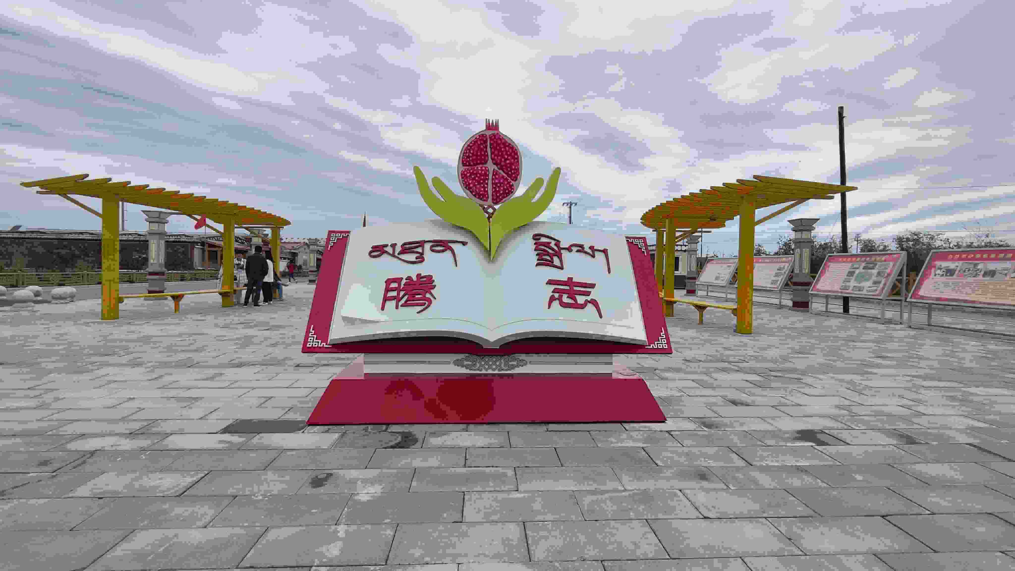 這些向好的變化離不開每一位村民的團結(jié)友愛、互幫互助。村口的廣場中間有一本打開的書,書頁上一雙手托舉著一個鮮艷的石榴,這就是果洛藏貢麻村新修建的“騰志”廣場?!膀v志”在藏語中意為“團結(jié)”,這也寓意著各民族像石榴籽一樣緊緊抱在一起,共育團結(jié)花,共享幸福果。