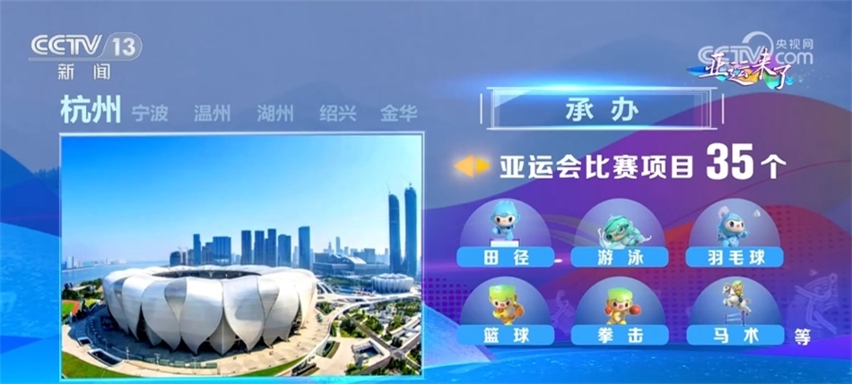 杭州設(shè)42個(gè)競賽場館、主亞運(yùn)村及2個(gè)亞運(yùn)分村,承辦田徑、游泳、羽毛球、籃球、拳擊、馬術(shù)等35個(gè)亞運(yùn)會(huì)比賽項(xiàng)目和22個(gè)亞殘運(yùn)會(huì)比賽項(xiàng)目。