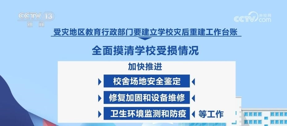 教育部強(qiáng)調(diào),要慎終如始做好災(zāi)后恢復(fù)重建各項(xiàng)工作,穩(wěn)慎做好受災(zāi)師生安置慰問(wèn)、補(bǔ)償救助等工作。受災(zāi)地區(qū)教育行政部門(mén)要建立學(xué)校災(zāi)后重建工作臺(tái)賬,全面摸清學(xué)校受損情況,加快推進(jìn)校舍場(chǎng)地安全鑒定、修復(fù)加固和設(shè)備維修、衛(wèi)生環(huán)境監(jiān)測(cè)和防疫等工作。確實(shí)在開(kāi)學(xué)前不能完成災(zāi)后重建的,要立足實(shí)際采取臨時(shí)轉(zhuǎn)移就學(xué)等舉措,全力保障正常開(kāi)學(xué)。各地各校要一體推進(jìn)防汛救災(zāi)和校園安全治理,健全校園安全常規(guī)檢查機(jī)制,持續(xù)深入排查整治風(fēng)險(xiǎn)隱患,有效防范原發(fā)、誘發(fā)性自然災(zāi)害和次生安全風(fēng)險(xiǎn)。