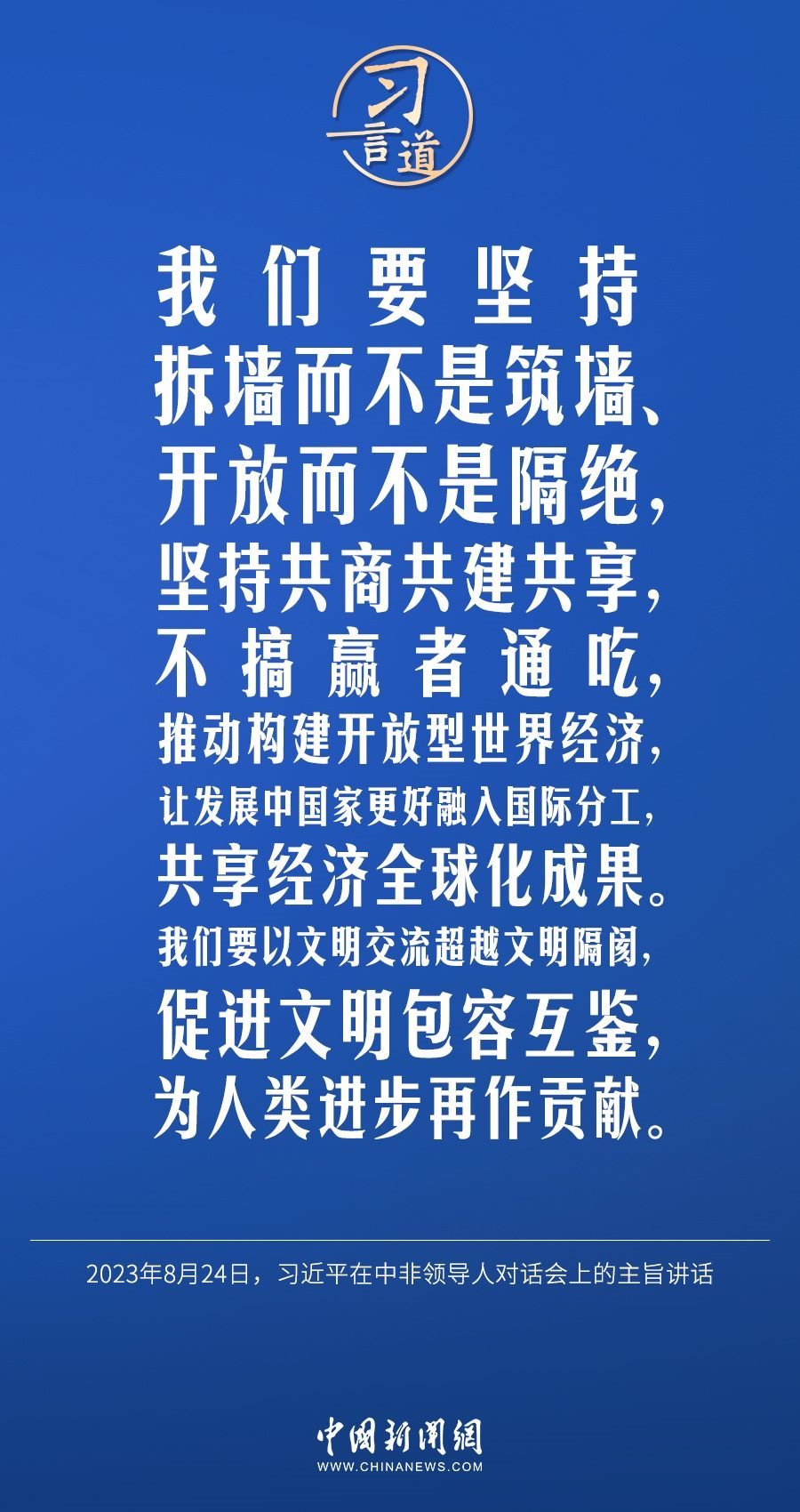 當(dāng)?shù)貢r間8月24日晚,國家主席習(xí)近平和南非總統(tǒng)拉馬福薩在約翰內(nèi)斯堡共同主持中非領(lǐng)導(dǎo)人對話會。習(xí)近平發(fā)表題為《攜手推進(jìn)現(xiàn)代化事業(yè) 共創(chuàng)中非美好未來》的主旨講話。習(xí)近平指出——