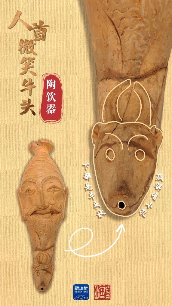 當(dāng)中國絲綢的美譽經(jīng)由古絲綢之路在西亞、歐洲等地傳揚時,西方文明也穿過風(fēng)沙與長歌,在中國留下了印記。人首微笑牛頭陶飲器出土于和田地區(qū)約特干遺址,為唐代時期文物。飲器上部為人首形,下部是牛頭狀,底部帶小圓孔,上下兩部分內(nèi)腔相通。人首上唇胡須外展卷翹,面帶微笑。牛頭微微上翹,牛角豎立攏圓。這種飲器造型源自“來通”,即末端為動物形或人首形的角杯,是小亞細(xì)亞和地中海地區(qū)常見的飲酒器具,絲綢之路沿線國家都有類似文物出土。