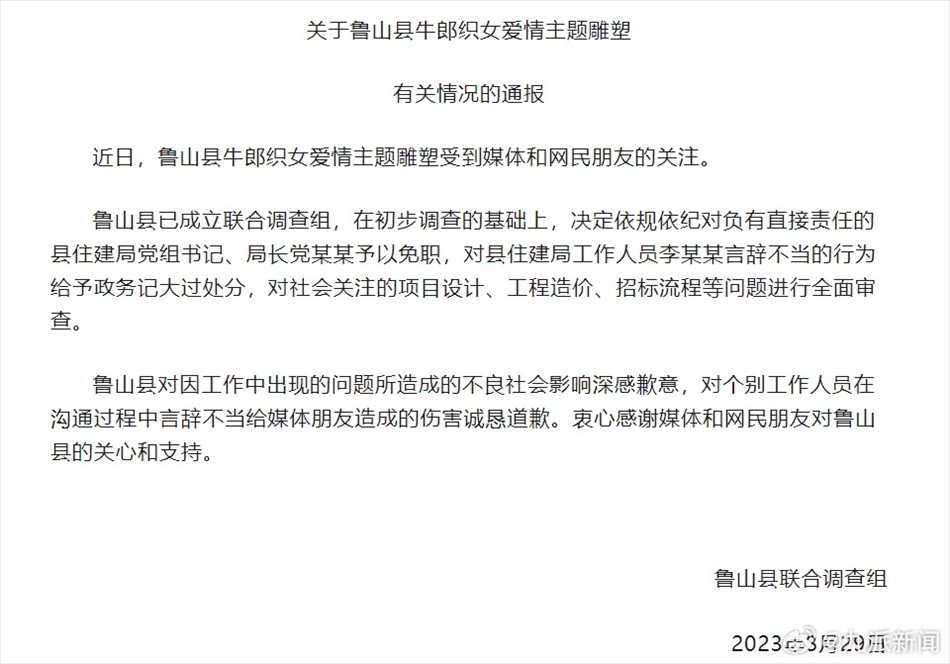 ·魯山縣通報(bào)花700多萬建牛郎織女雕塑:縣住建局局長免職,罵記者的工作人員記大過。