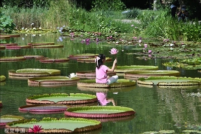 北京,國家植物園南園,公園舉辦王蓮承載小孩的活動(dòng)。