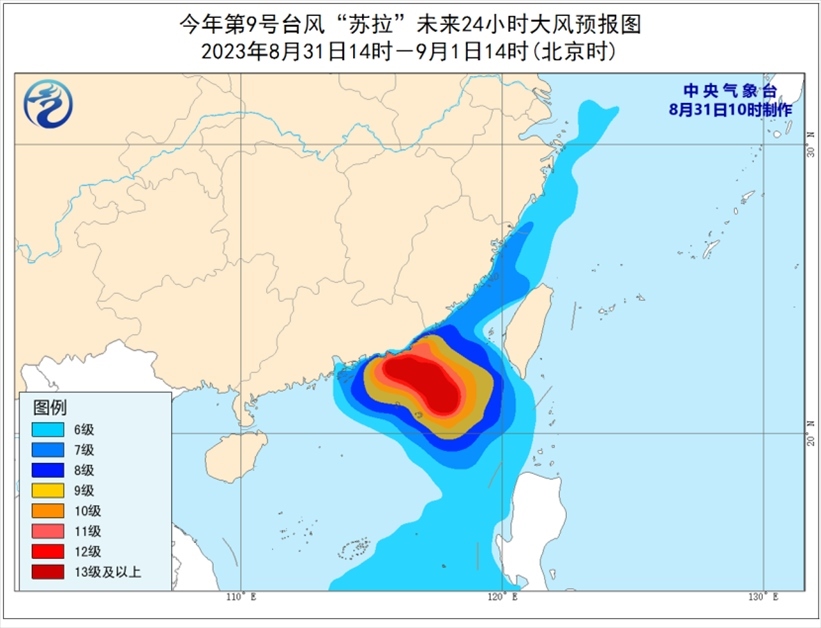央視網(wǎng)消息:中央氣象臺8月31日10時(shí)繼續(xù)發(fā)布臺風(fēng)紅色預(yù)警,今年第9號臺風(fēng)“蘇拉”(超強(qiáng)臺風(fēng)級)的中心今天(31日)上午10點(diǎn)鐘位于廣東汕尾東南方向大約335公里的南海東北部海面上,就是北緯21.0度、東經(jīng)118.0度,中心附近最大風(fēng)力有17級(58米/秒),中心最低氣壓為925百帕,七級風(fēng)圈半徑250-280公里,十級風(fēng)圈半徑130公里,十二級風(fēng)圈半徑70公里。
