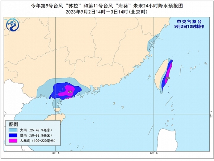 降水預報:9月2日14時至3日14時,受“蘇拉”和“??庇绊懀瑥V東西南部、廣西東南部、福建東北部沿海、臺灣島東部等地有大到暴雨,其中,廣東西南部、臺灣島東部等地部分地區(qū)有大暴雨(100~220毫米)。