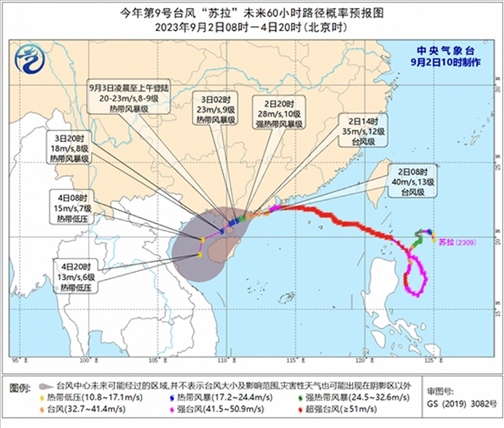 另外,今年第9號臺風“蘇拉”的中心今天(9月2日)上午8點鐘位于廣東省臺山市近海,就是北緯21.6度、東經(jīng)112.7度,中心附近最大風力有13級(40米/秒),中心最低氣壓為960百帕。