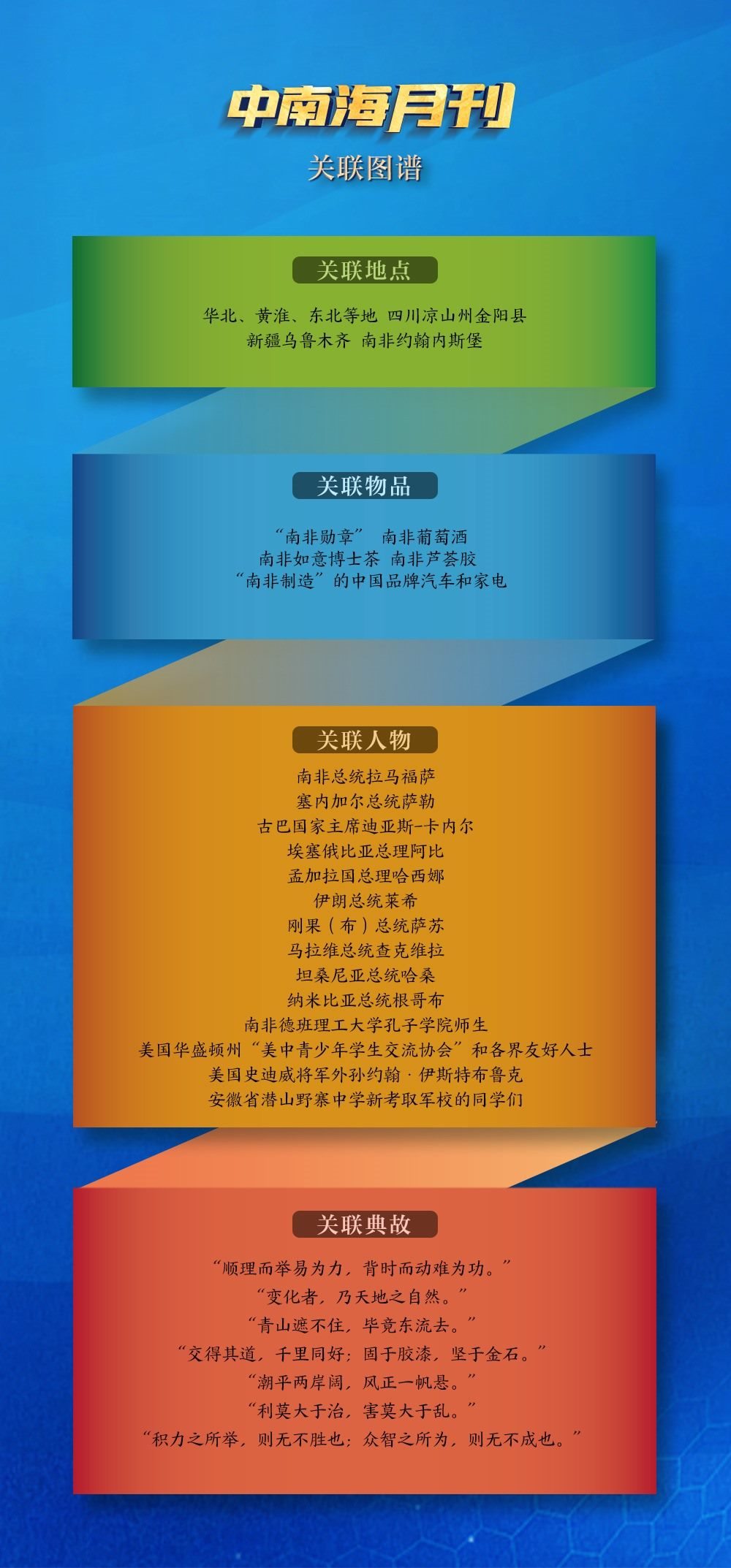 關聯(lián)物品“南非勛章”吸引了世界目光。8月22日,在南非比勒陀利亞總統(tǒng)府,拉馬福薩總統(tǒng)捧起一枚“南非勛章”,鄭重為習近平主席佩戴上。這是南非授予重要友好國家元首的最高級別勛章和最高榮譽,也成為兩國“同志加兄弟”特殊友好關系的有力見證。