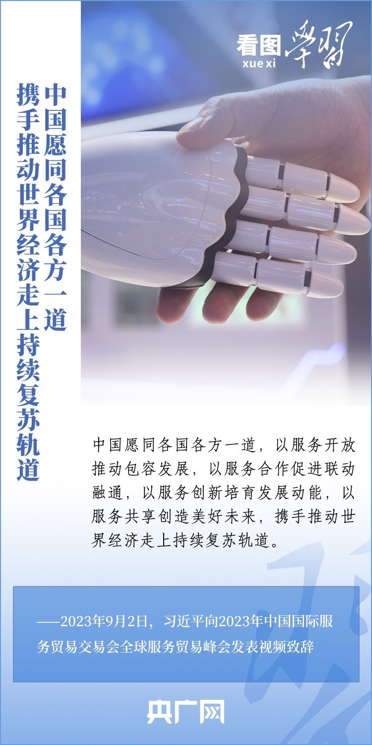9月2日上午,以“開放引領(lǐng)發(fā)展 合作共贏未來”為主題的2023年中國國際服務(wù)貿(mào)易交易會(huì)在北京舉行。國家主席習(xí)近平向2023年中國國際服務(wù)貿(mào)易交易會(huì)全球服務(wù)貿(mào)易峰會(huì)發(fā)表視頻致辭表示,中國愿同各國各方一道,攜手推動(dòng)世界經(jīng)濟(jì)走上持續(xù)復(fù)蘇軌道。一起來學(xué)習(xí)!