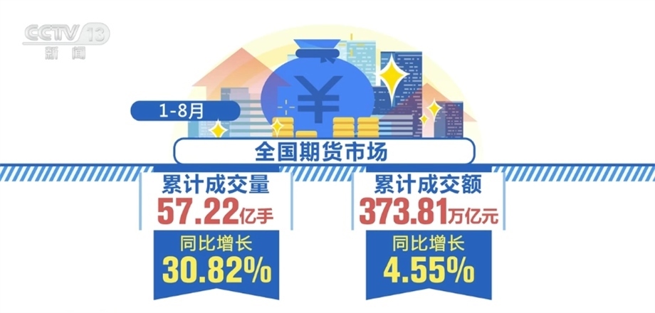 中國(guó)期貨業(yè)協(xié)會(huì)數(shù)據(jù)顯示,8月全國(guó)期貨市場(chǎng)成交量為9.49億手,成交額為60.67萬(wàn)億元,同比分別增長(zhǎng)47.76%和23.49%,環(huán)比分別增長(zhǎng)15.38%和18.92%。